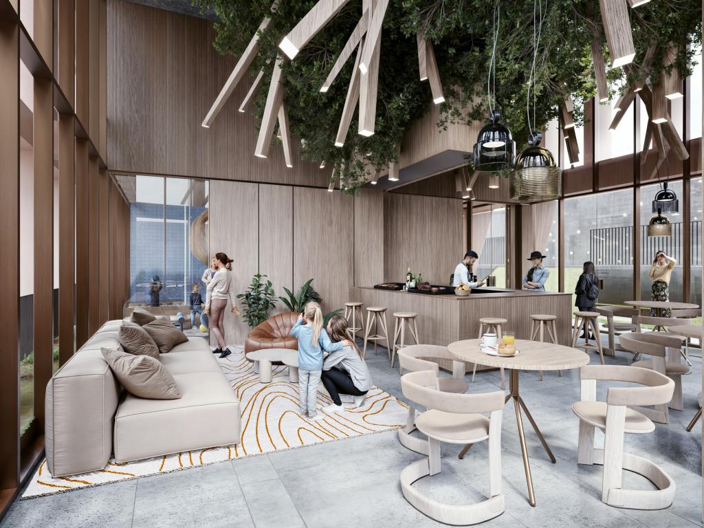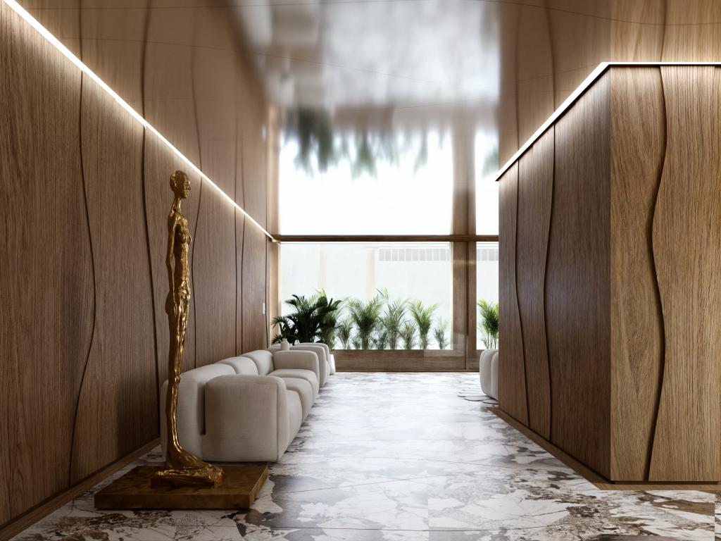 O apartamento modelo que serve de referência para os futuros moradores se destaca pelo conceito contemporâneo e acolhedor, marcado pela integração de espaços, uso de materiais naturais e tons terrosos. Com três amplas suítes, a escolha foi uma interpretação da natureza e integração ao ambiente, por meio de uma paleta em madeira clara, pedra e cimento queimado que cria um ambiente sofisticado, mas ao mesmo tempo sereno e aconchegante. A cozinha e a sala de estar são conectadas em um layout aberto, que valoriza a luminosidade natural e a funcionalidade, enquanto detalhes como painéis ripados, iluminação embutida e mobiliário de linhas retas reforçam a elegância minimalista do projeto.