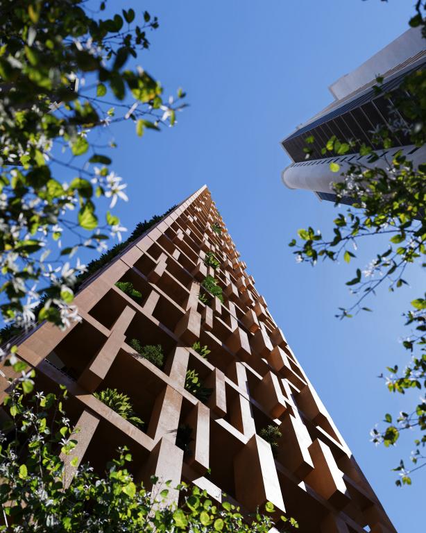 Com apenas 26 unidades, o Auris Residenze traz ao Brasil o conceito de "arquitetura viva", em que a integração entre o edifício e a natureza é um dos principais diferenciais. A fachada, composta por brises que lembram galhos de árvore e jardineiras suspensas, não só garante uma estética única, mas também contribui para a eficiência térmica do edifício e reduz em até 42% o consumo de ar-condicionado. O uso de concreto pigmentado na fachada, em tom terracota, proporciona durabilidade sem a necessidade de pinturas ao longo do tempo.