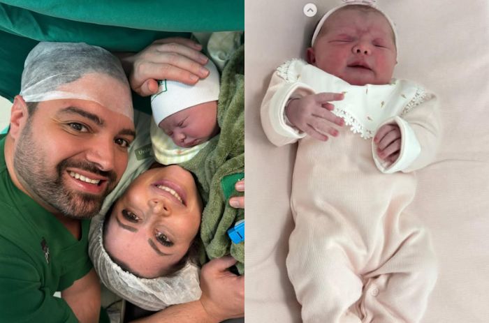Carol De Toni deu à luz Bárbara em uma maternidade, e divulgou a primeira foto da família completa ao lado do marido, Matheus Bortoluzzi, logo após o parto.