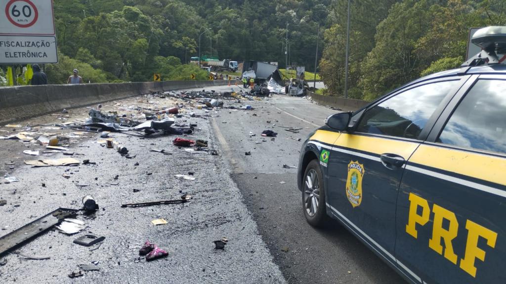 Segundo o relato da Polícia Rodoviária Federal (PRF), o engavetamento ocorreu por volta das 4h45, no quilômetro 667, e envolveu um caminhão-baú, uma carreta e a van.