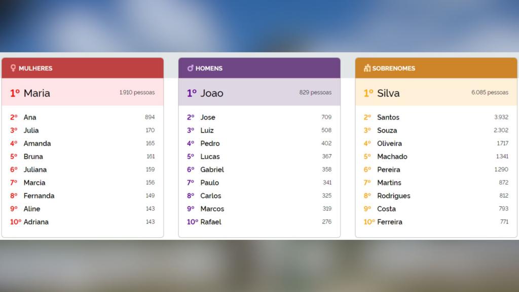 Em Tijucas, cidade mais populosa do Vale com cerca de 58,6 mil habitantes, o nome Maria aparece em 1.910 pessoas, seguido de João, com 829 registros. Já o sobrenome Silva predomina amplamente, com 6.085 ocorrências, demonstrando a força da tradição familiar e da herança linguística portuguesa.