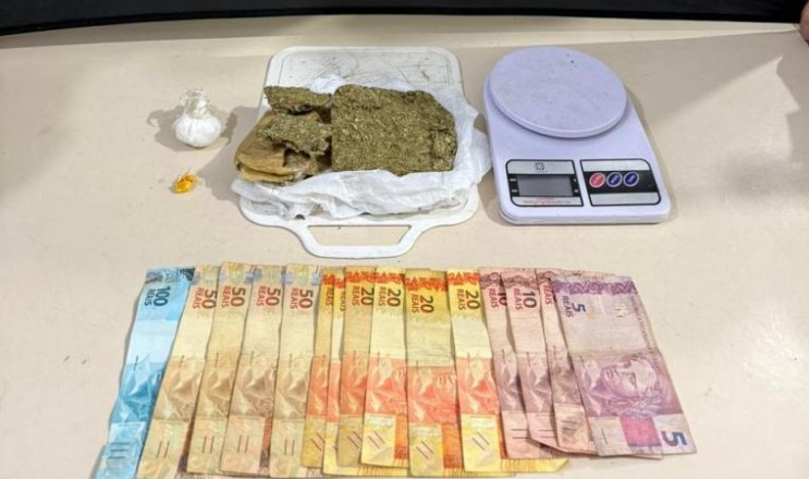 Dentro do imóvel, a guarnição encontrou tudo o que caracteriza um ponto ativo de tráfico: uma balança de precisão, R$ 455 em notas miúdas, aproximadamente 140 gramas de maconha — já separadas entre porções menores e um bloco maior —, além de cerca de 16 gramas de cocaína, divididas em duas quantidades distintas. Havia também materiais usados para fracionamento e embalagem dos entorpecentes.