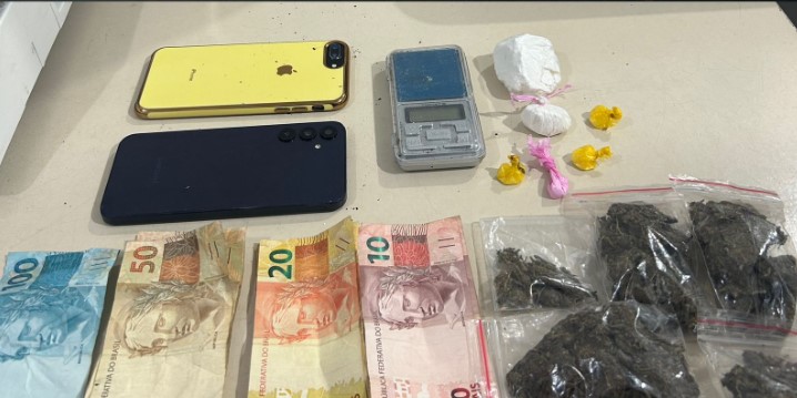 Com a confirmação, os policiais entraram na residência e localizaram um dos suspeitos, que confessou participar do esquema e mostrou onde os entorpecentes estavam guardados. No interior da quitinete foram encontrados 102 gramas de maconha divididas em porções, 43 gramas de cocaína, embalagens para fracionamento, uma balança de precisão, R$ 350 em dinheiro e um celular.