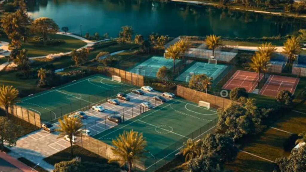 O plano geral inclui mais de 20 torres residenciais, cerca de 600 lotes de alto padrão, área comercial, além de uma estrutura esportiva robusta que reforça o caráter premium do complexo. Entre os equipamentos anunciados estão sete quadras de padel, seis quadras de areia, um campo de futebol oficial, além de um centro de treinamento profissional equipado com auditório, salas de imprensa, consultórios, áreas de recuperação física e alojamentos.