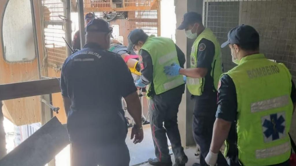 Ele ficou suspenso na fachada após queda do equipamento e foi resgatado por colegas antes do atendimento dos bombeiros. Foto: CBMSC