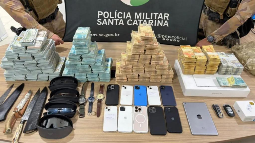 No quarto, os policiais se depararam com um volume incomum de dinheiro vivo e dispositivos eletrônicos. Entre os itens recolhidos estavam R$ 1.131.220 em espécie e US$ 721.300, valor que, convertido ao câmbio do dia, ultrapassa R$ 5 milhões. Também foram apreendidos dez celulares, um tablet, um notebook, relógios e chaves de veículos, materiais que, segundo a PM, podem ajudar a rastrear movimentações financeiras e possíveis conexões da quadrilha.