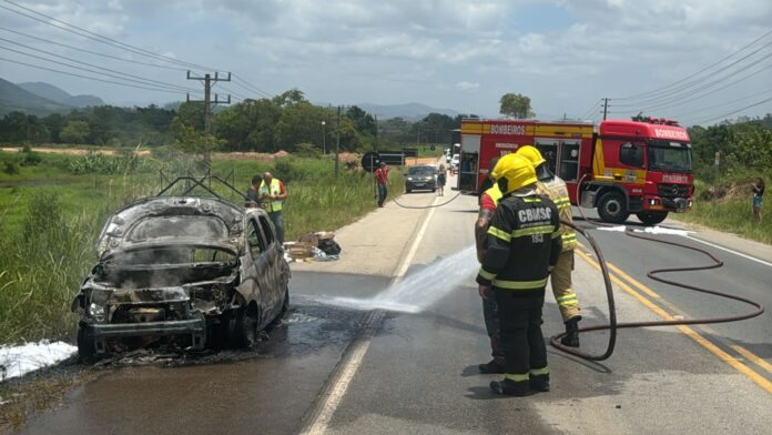 Um Fiat Mobi foi consumido pelo fogo na manhã desta segunda-feira enquanto seguia pela SC-410, no trecho entre São João Batista e Canelinha. De acordo com o motorista, o veículo apresentou uma falha no motor e começou a pegar fogo inesperadamente.