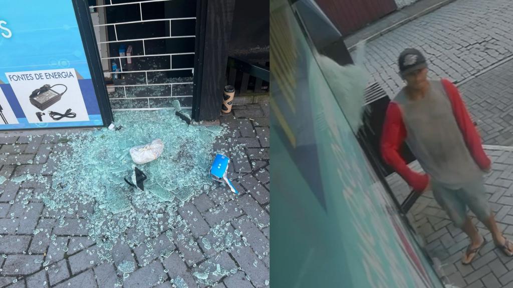 Imagens de câmeras de segurança registraram a invasão, a quebra da porta de vidro e o furto de itens como capinhas de celular. Ocorrência foi registrada pela polícia.