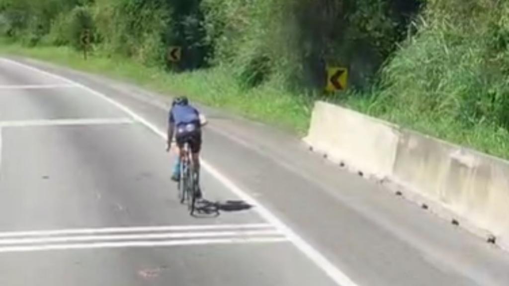 Um comportamento de alto risco chamou a atenção de quem trafegava pela BR-101, em Balneário Camboriú, quando um ciclista passou a ocupar a pista de rolamento na descida do Morro do Boi, no sentido Itapema, expondo-se a um possível acidente com veículos de grande porte. A situação foi registrada por um motorista que seguia logo atrás e precisou reduzir a velocidade para evitar uma colisão.