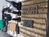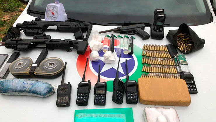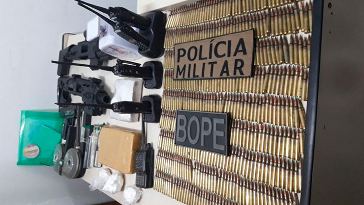 Um adolescente tentando se esconder num dos casebres. Com ele foi encontrado droga, 2 munições de revolver e certa quantia em dinheiro. Em outro ponto da localidade do loteamento foram apreendidos: 434 munições de uso restrito, calibre 5.56, 2,3 kg de pasta base de cocaína, um carregador em caracol para 100 munições, um carregador para 30 munições, lança perfume, balança de precisão, 2 ‘kit’s Roni’, geralmente utilizado para ampliar o poder de fogo de pistolas 9mm, rádio comunicadores e uma arma/pistola em tese de pressão.