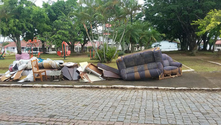 Diversos moveis danificados foram deixados em cima de uma das calçadas da praça impedindo a passagem dos pedestres. A suplente registrou as imagens e postou no fecebook à indignação. "Quem fez isso na pracinha do Coroado??? Eu realmente não acredito!!! Já existe Disk Entulho", desabafou.