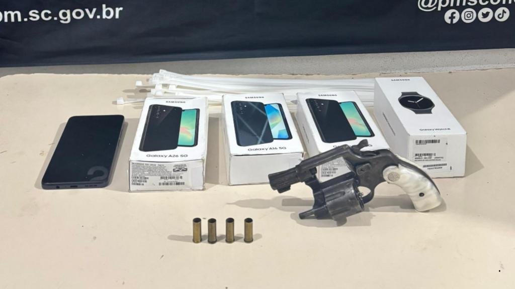 Dentro do carro, os policiais encontraram um revólver calibre .32 com quatro munições deflagradas, além de quatro aparelhos celulares novos e a embalagem de um relógio smartwatch, contendo apenas o carregador. O condutor, de 33 anos, confessou participação no crime e relatou a atuação de outros dois envolvidos que teriam deixado a cidade.