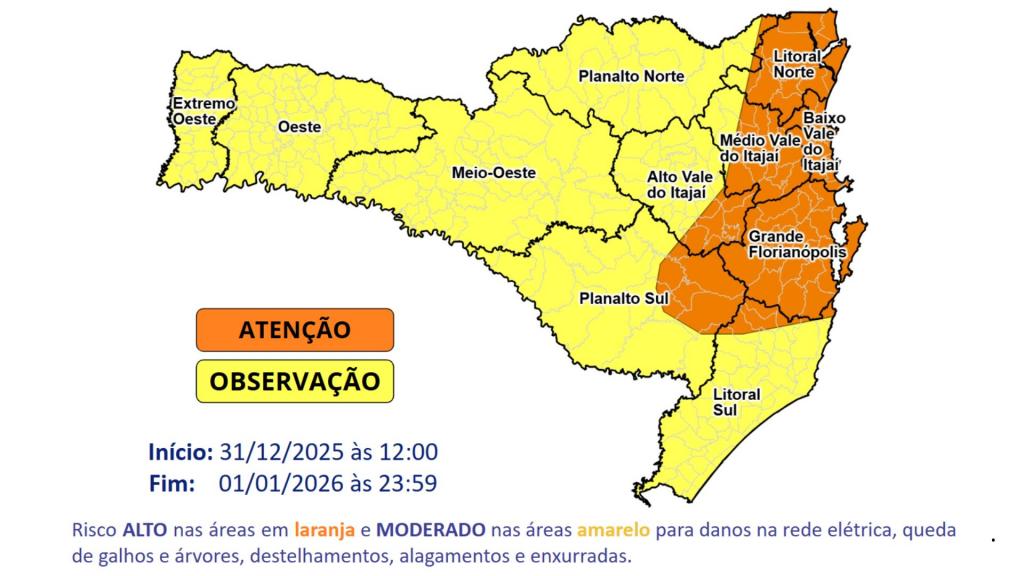Chuvas fortes concentradas em curto intervalo de tempo, acompanhadas por ventos intensos e descargas elétricas, devem atingir o território catarinense nos próximos dias, elevando o risco de alagamentos, enxurradas, quedas de árvores, destelhamentos e danos na rede elétrica, especialmente no período da virada do ano.