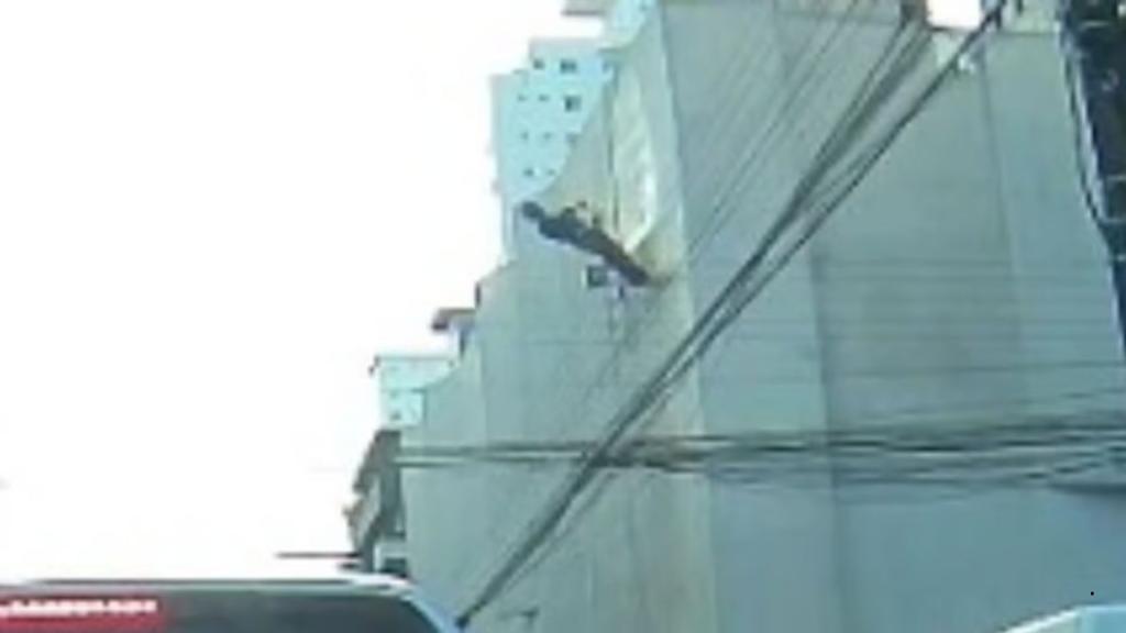 Imagens registradas por câmeras instaladas em um veículo flagraram o momento do incidente. Após o choque, a própria vítima conseguiu descer até o solo de forma controlada, utilizando técnica de rapel, sem necessidade de resgate especializado.