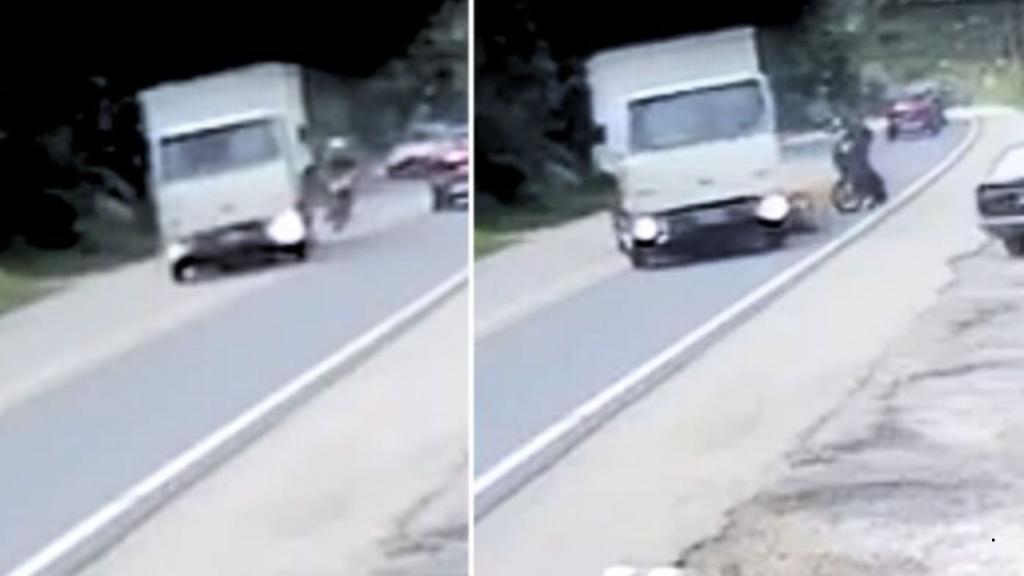 As imagens mostram o momento em que um caminhão Ford Cargo 815 e uma motocicleta Honda Bros, que seguiam no sentido São João Batista–Nova Trento, colidem na via. Com o impacto, o motociclista foi arremessado ao solo, sofrendo ferimentos pelo corpo e apresentando suspeita de fratura.