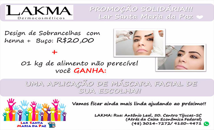 A empresa de beleza Lakma Dermocosméticos localizada na rua Antônio Leal, atrás da Caixa Econômica Federal, na região central de Tijucas está promovendo uma campanha solidária para contribuir com o Lar Santa Maria da Paz.