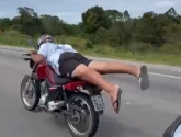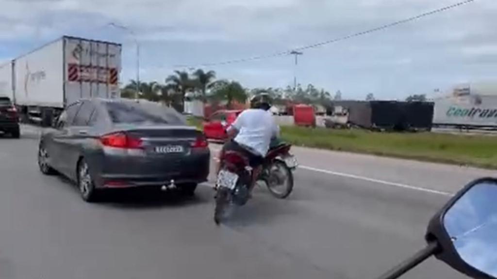 As imagens mostram pelo menos três motociclistas circulando entre caminhões e veículos leves, em tráfego intenso. Em determinado momento, um dos condutores realiza a manobra conhecida como “superman”, quando o piloto deita sobre a motocicleta, ficando com o corpo estendido sobre o veículo em movimento.