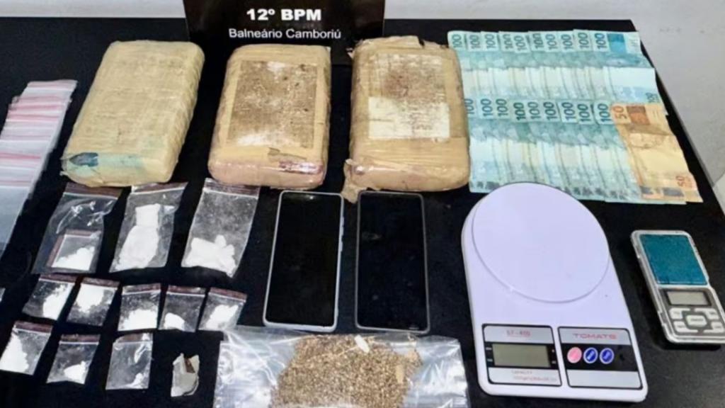 Diante dos indícios, os agentes realizaram buscas no imóvel e apreenderam 35,8 gramas de cocaína, 3,220 quilos de skunk, 4,9 gramas de maconha do tipo ICE, além de R$ 1.950 em espécie e dois aparelhos celulares, materiais que, segundo a corporação, são comumente associados à prática de tráfico de drogas. O Fiat Mobi também foi identificado como parte da dinâmica de distribuição dos entorpecentes.