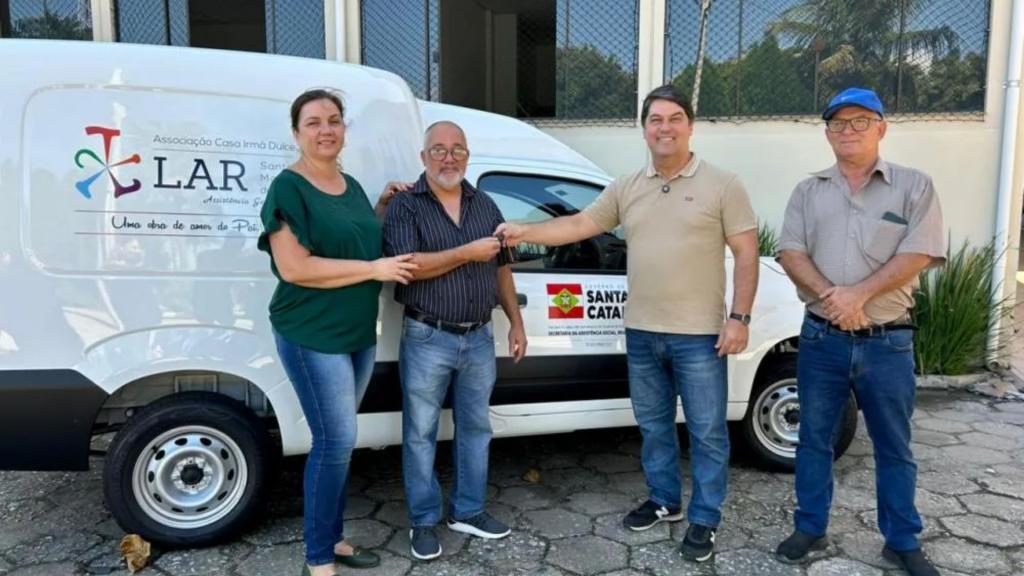 Nesta segunda-feira (19), o deputado estadual Emerson Stein (MDB) formalizou a entrega de um veículo utilitário ao Lar Santa Maria da Paz, em Tijucas, como parte de um investimento total de R$ 150 mil viabilizado por meio de recursos de seu mandato, com apoio do governador Jorginho Mello. A solenidade ocorreu na própria sede da instituição e contou com a presença de representantes da entidade.