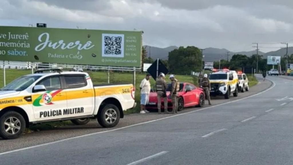 Após o registro policial, o veículo foi identificado por câmeras de monitoramento rodoviário e abordado pela PMRv na SC-402. Conforme a corporação, o Porsche era conduzido por um homem de 39 anos, natural do Rio Grande do Sul, com antecedentes por tráfico de drogas, posse de arma e homicídio. A Polícia Militar informou que o motorista tentou fugir da abordagem, mas foi cercado pelas guarnições. No interior do carro foram encontrados R$ 5 mil em dinheiro. Ele foi encaminhado à delegacia e autuado por receptação.