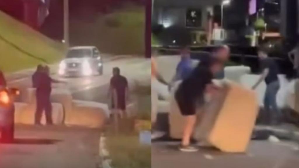 Material caiu sob uma ponte de Brusque na noite de segunda-feira (19); populares ajudaram no recolhimento enquanto veículo permaneceu estacionado na via. Fotos: Brusque Discover/Reprodução