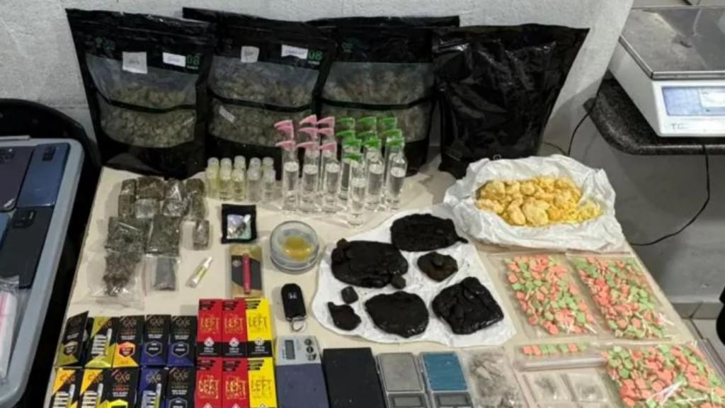As guarnições realizaram buscas no imóvel indicado, onde localizaram outros três envolvidos e uma grande quantidade de drogas, incluindo skunk, ecstasy, MDMA, derivados concentrados de maconha, óleo de THC e frascos de substância inalante conhecida como “loló”.