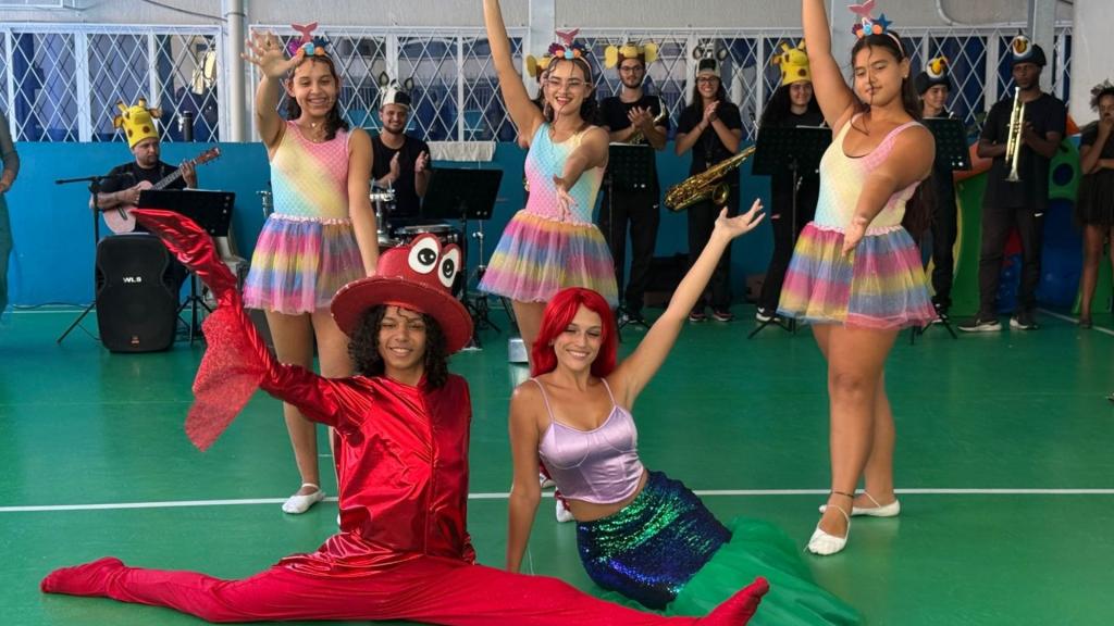 Durante a oficina, as crianças participam de apresentações com músicas infantis, conhecem diferentes instrumentos musicais e recebem instrumentos de percussão para interagir diretamente com as atividades. A programação também inclui coreografias simples, que incentivam o movimento corporal, além de momentos de interação com personagens, tornando a experiência mais envolvente.