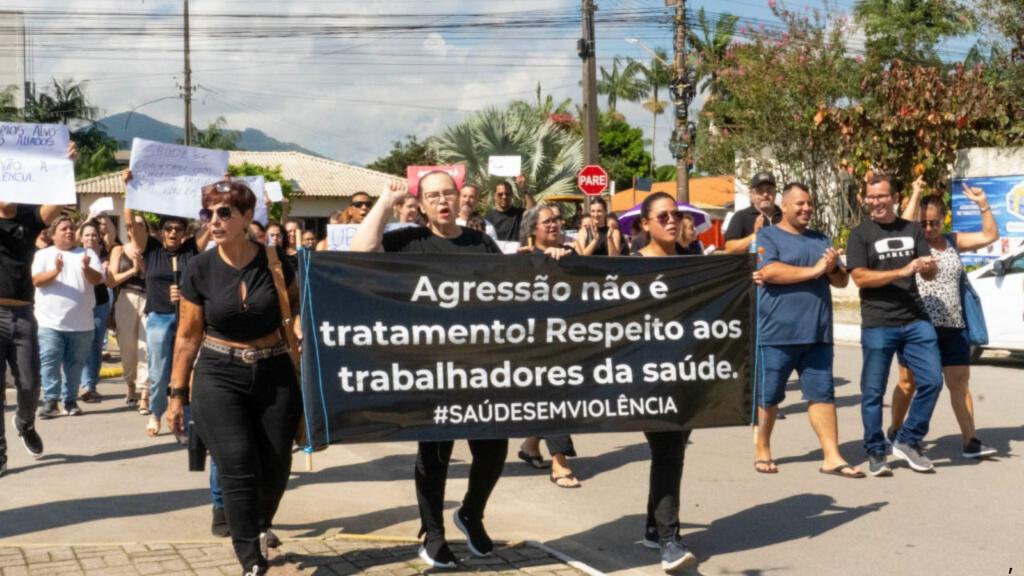 Os participantes percorreram a Avenida Cantório Florentino da Silva em passeata até a UBS José Domingos Dalsasso, com mensagens de apoio à profissional agredida e de defesa da segurança no ambiente de trabalho.