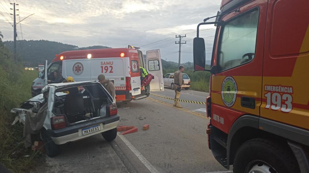 Um grave acidente registrado na manhã desta segunda-feira, 13 de abril, mobilizou equipes de resgate na rodovia SC-410, no bairro Cardoso, em São João Batista. A colisão envolveu um ônibus e um Fiat Uno, deixando um jovem de 23 anos preso às ferragens.