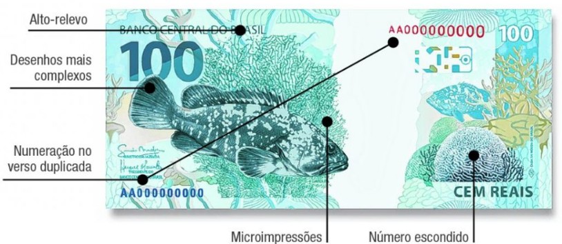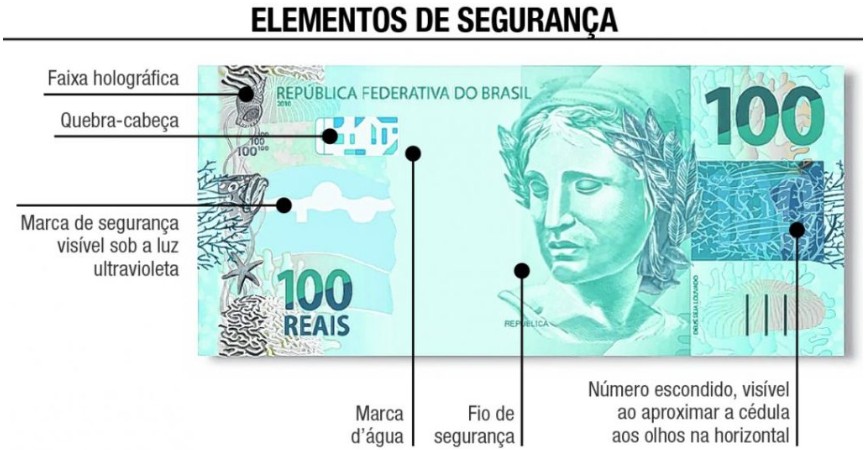 -Marca d’água: ao colocar contra a luz, é possível ver a imagem e o valor da cédula.