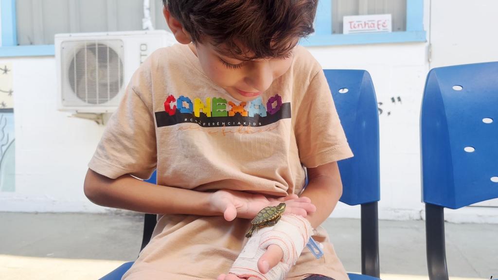 A criança, internada há 26 dias na ala pediátrica, solicitou rever sua tartaruga de estimação. Sensibilizada, a equipe assistencial organizou a visita, considerada relevante para o bem-estar emocional do paciente.