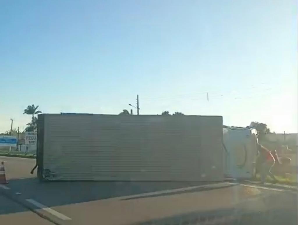Uma mulher passou por momentos de tensão na manhã desta segunda-feira (20), após o caminhão que conduzia tombar na BR-101, em Porto Belo. Apesar do susto, ela saiu ilesa. O acidente ocorreu por volta das 8h, no km 157 da rodovia, no sentido Norte (Curitiba).