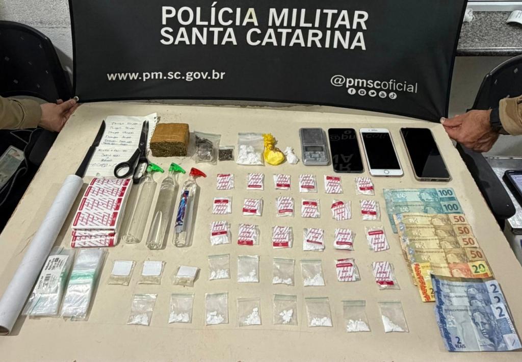 No endereço informado, um segundo suspeito tentou fugir ao perceber a presença policial, mas foi rapidamente detido. Na residência, os agentes localizaram diversas porções de entorpecentes, incluindo cocaína, maconha e outras drogas, além de balança de precisão, materiais para fracionamento, anotações do tráfico e dinheiro.