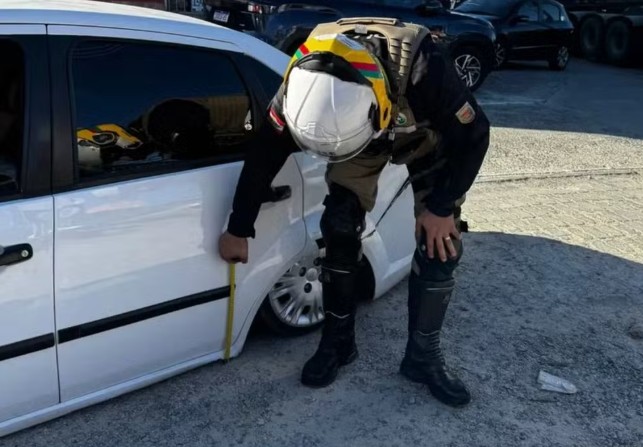 Para confirmar a irregularidade, agentes da Polícia Militar Rodoviária Estadual (PMRv) utilizaram uma fita métrica no local. A legislação brasileira exige que veículos tenham pelo menos 10 centímetros de altura do solo.