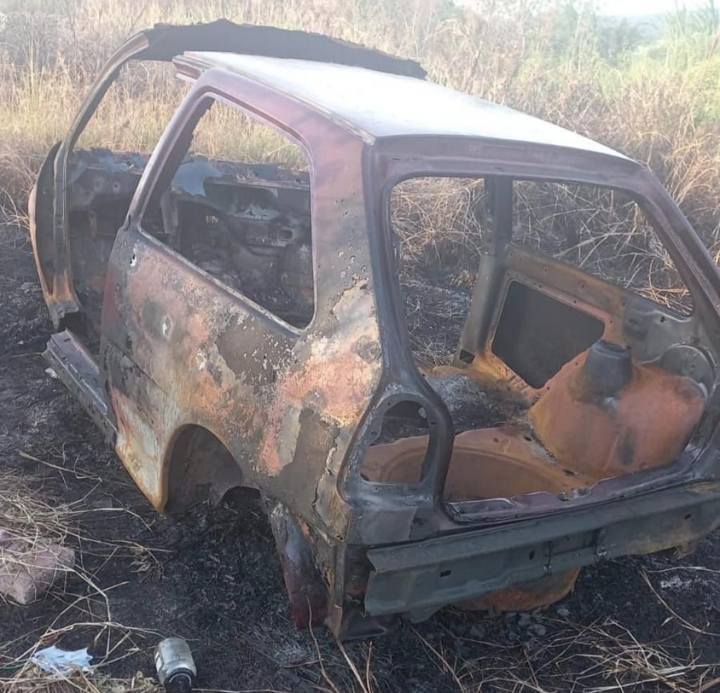 Além do veículo, os policiais também identificaram sinais de incêndio na vegetação ao redor, o que levanta a suspeita de que o fogo tenha sido provocado de forma intencional.