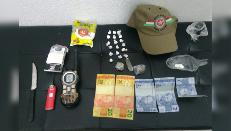 No local os policiais abordaram quatro suspeitos. Ao lado deles, foram encontradas 05 buchas de cocaína, 03 de maconha e 01 rádio comunicador.
