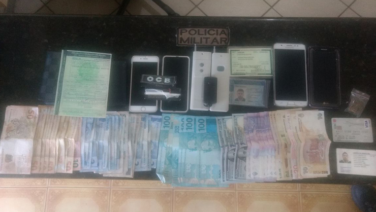 Os policiais localizaram o veículo e ao abordá-lo, o condutor fazia uso de maconha. Em uma busca pessoal, foram apreendidos a quantia de R$ 1.309,00 em dinheiro e dois celulares.