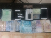 Em vistoria no interior do carro foram localizados, escondidos no painel, dois aparelhos bloqueadores. Já no console da alavanca de marcha, foram encontrados um envelope contendo 300 dólares, 1000 pesos, documento estrangeiro, cartão de crédito e mais dois aparelhos celulares.