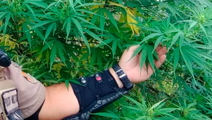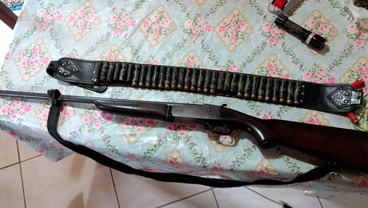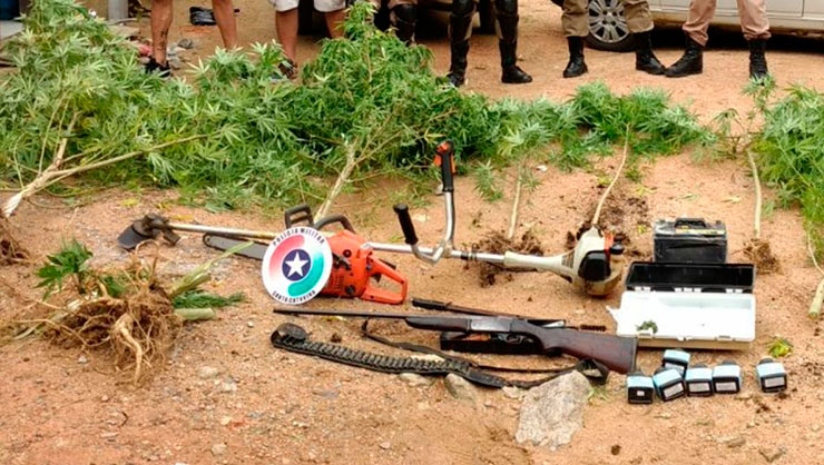 Na residência do suspeito de 41 anos, os policiais realizaram buscas, mas nada foi encontrado. Os agentes sentiram um forte odor de maconha vindo da casa ao lado e ao chegarem no imóvel foi localizado sete pés de maconha plantados, três deles com aproximadamente mais de um metro de altura. Após uma varredura pela residência foi encontrado, uma espingarda calibre 32, diversos cartuchos calibre 32, materiais para recarga, uma pequena porção de maconha, uma motosserra, uma bateria automotiva e uma roçadeira de procedência duvidosa.