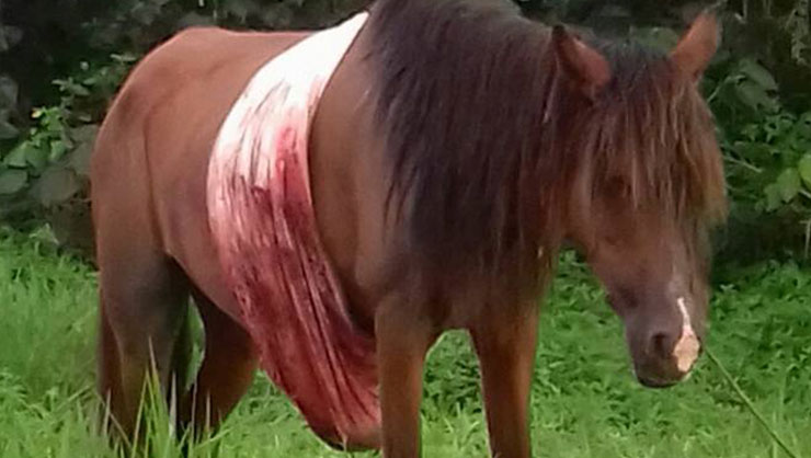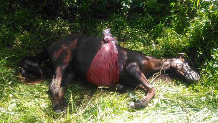 Na manhã desta terça-feira (13), um cavalo foi visto abandonado em um terreno localizado na Rua 306, no bairro Meia Praia, em Itapema. O animal está debilitado e se encontra deitado, devido um grande ferimento na região da barriga.
