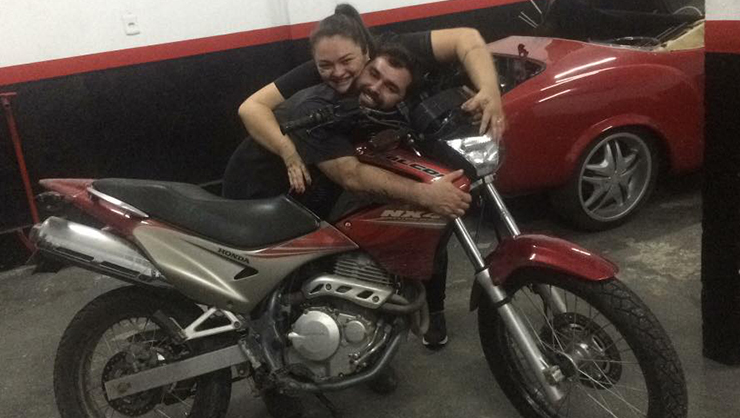 Em uma imagem postada em sua rede social Facebook, emocionado, o empresário aparece abraçado com a moto e ao mesmo tempo recebendo o carinho da esposa.