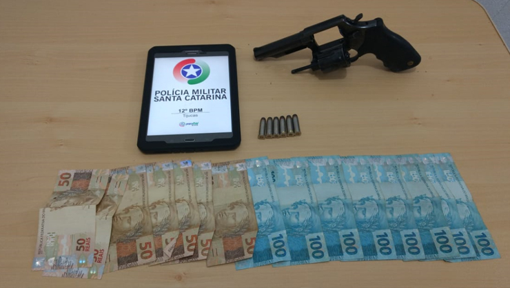 Os policias foram até o local e abordaram um homem com as características repassadas. Em uma revista pessoal foi encontrado com o suspeito, um revólver, calibre 38, com a numeração raspada, com 6 munições intactas e R$1100,00 em notas de 100 e 50 reais.