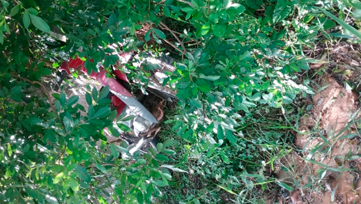 A Honda/Biz vermelha estava escondida embaixo de uma árvore encostada no muro de uma residência, coberta por alguns galhos da árvore.