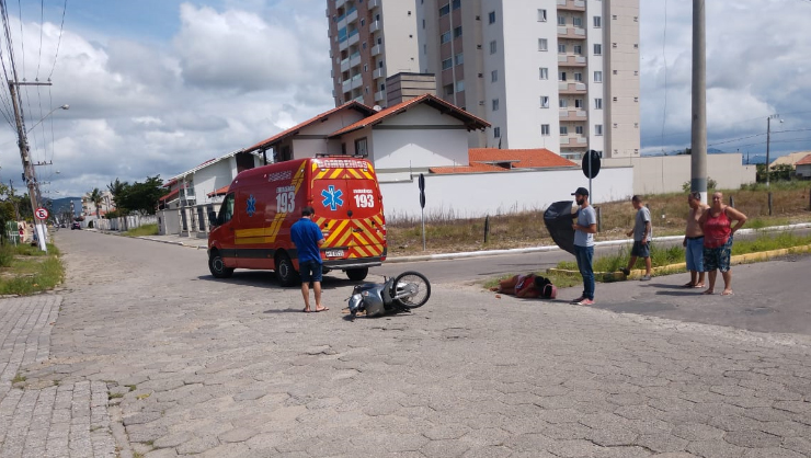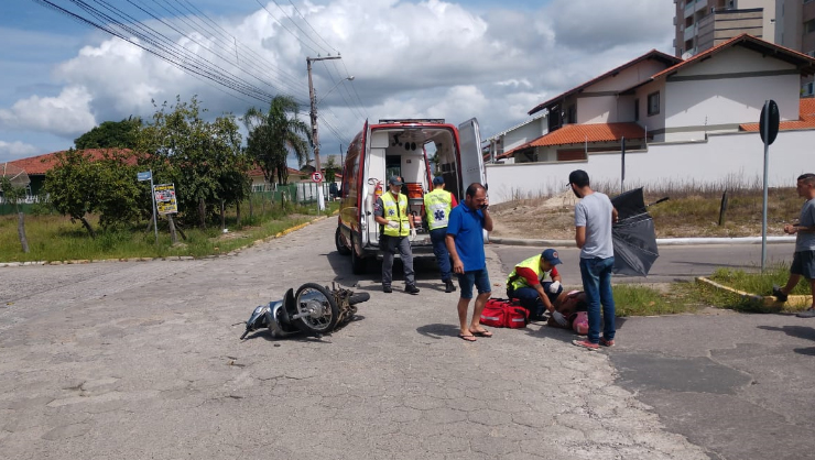 Um acidente de trânsito entre um carro e uma motocicleta deixou uma motociclista ferida na manhã deste sábado (16) em Tijucas. A colisão aconteceu na rua Marechal Deodoro, no centro da cidade.