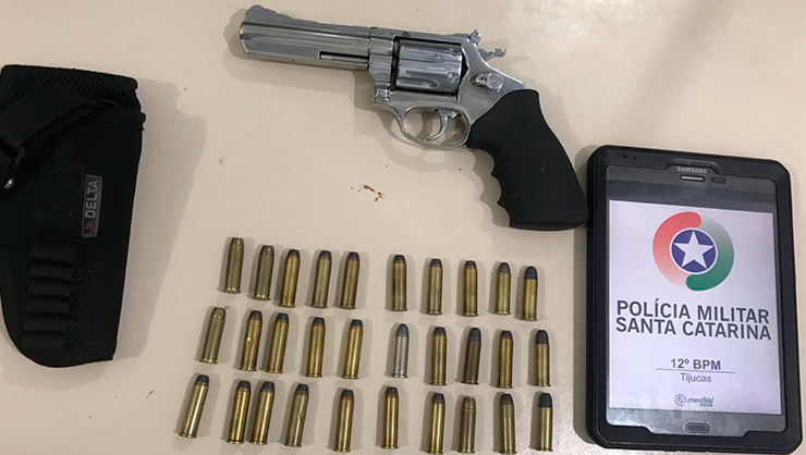 O condutor, informou a guarnição que no porta luvas do veículo havia um revólver. Em buscas no veículo, foi localizado um revólver calibre 38; aberto para 357, 10 munições de calibre 38 e 20 munições de calibre 357.