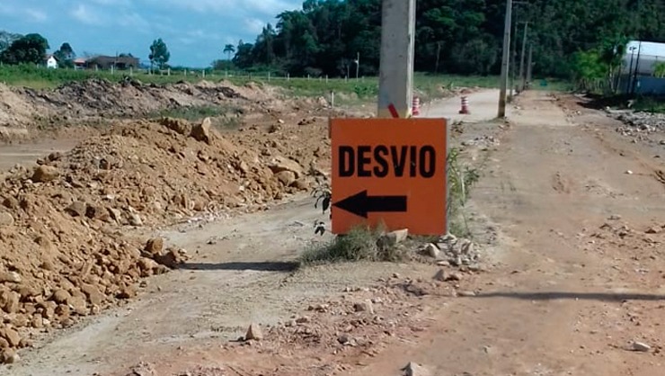 Durante o dia quem trafega pela avenida pode observar uma placa sinalizando que há um desvio.