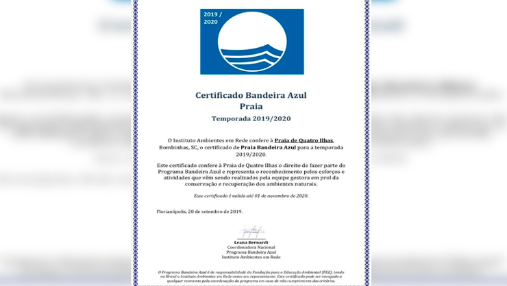 As praias de Quatro Ilhas e Mariscal, em Bombinhas, foram aprovadas pelo júri internacional para receberem o certificado do Programa Bandeira Azul. A avaliação foi realizada durante uma reunião em Copenhagen, na Dinamarca, nesta segunda-feira, 23. Com o selo internacional, as duas praias passam a ser consideradas oficialmente umas das melhores áreas para os banhistas.