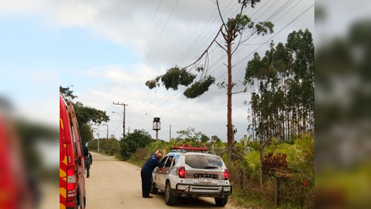 Um homem foi resgatado no topo de uma árvore na tarde desta segunda-feira (30) após galhos caírem em cima de fios de alta tensão. O Corpo de Bombeiros foi acionado para o resgate no bairro Sertão do Trombuto, em itapema.