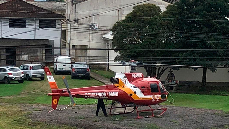 O helicóptero Arcanjo 01 do Corpo de Bombeiros/Samu aterrissou na tarde desta quinta-feira (17) no pátio do hospital São José em Tijucas para o resgate de um paciente com traumatismo craniano.