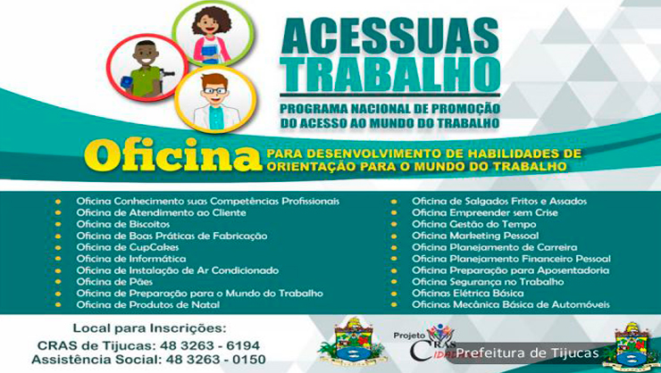 A Secretaria Municipal de Ação Social e Direitos Humanos de Tijucas, está promovendo uma série de oficinas de maneira gratuita para a comunidade. Através do Programa de Promoção do Acesso ao Mundo do Trabalho (Acessuas Trabalho) a ideia é proporcionar mais oportunidades de autonomia para as famílias usuárias da Política de Assistência Social do município. As oficinas serão realizadas em parceria com o SENAI/SC.
